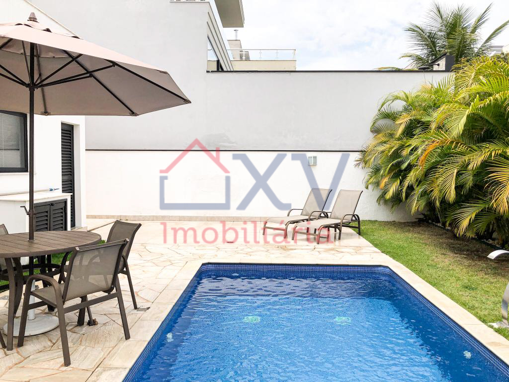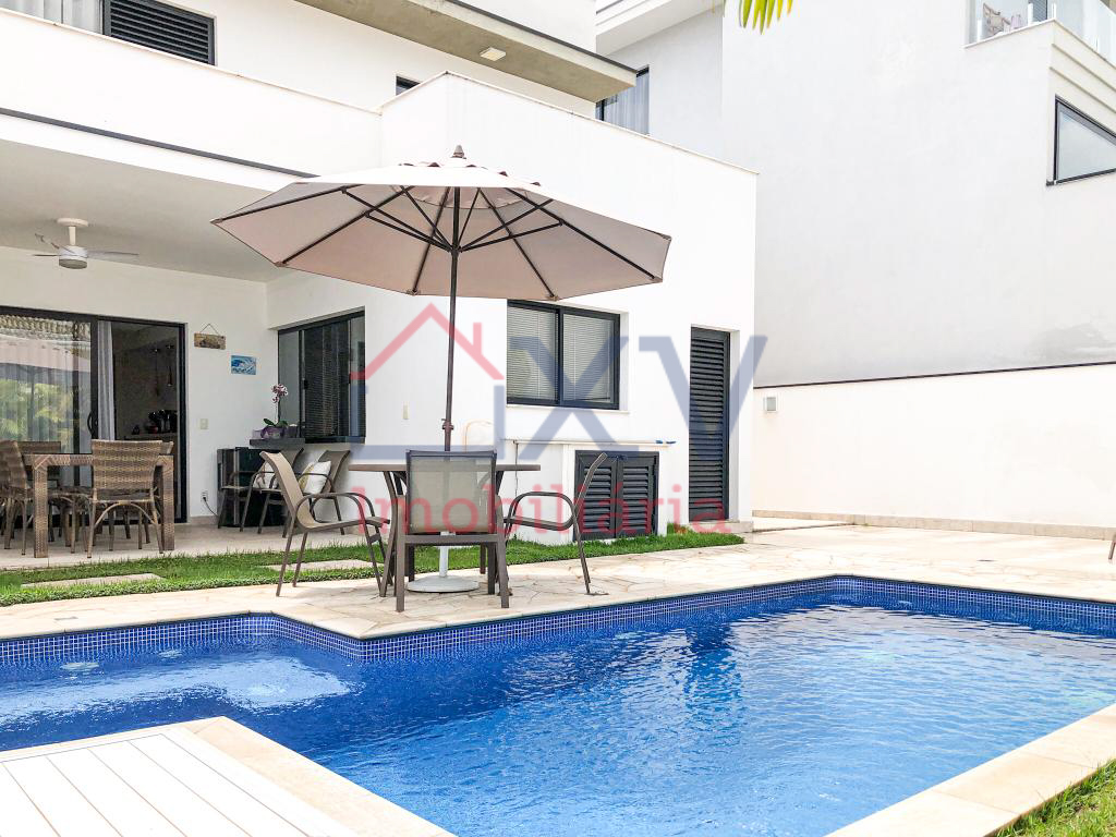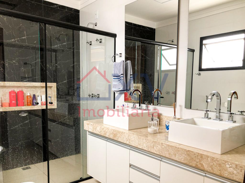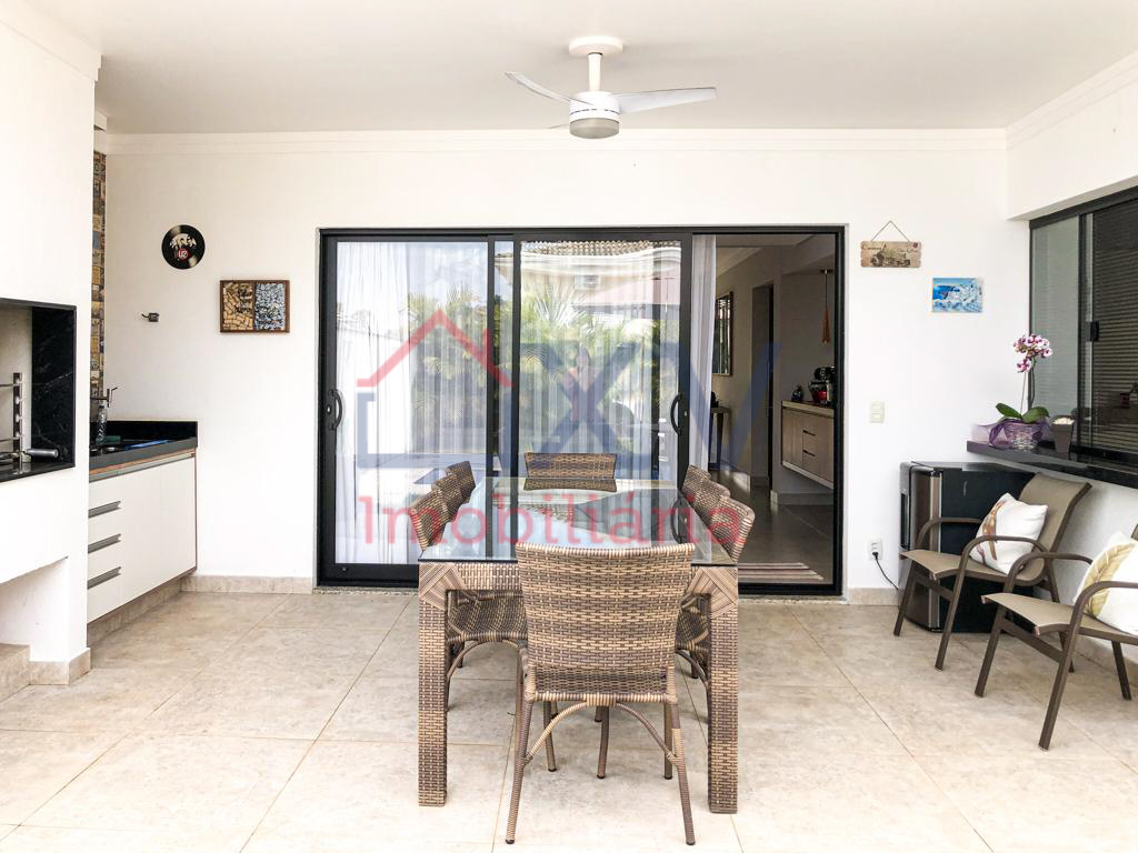 Casa sobrado, sendo 03 suítes com varanda na parte de cima, todas com móveis planejados. E, na parte de baixo, sala de estar com pé direito duplo, sala de TV, sala de jantar, w.c, cozinha, dispensa, lavanderia, corredor lateral e uma área de lazer com piscina e churrasqueira e W.C.